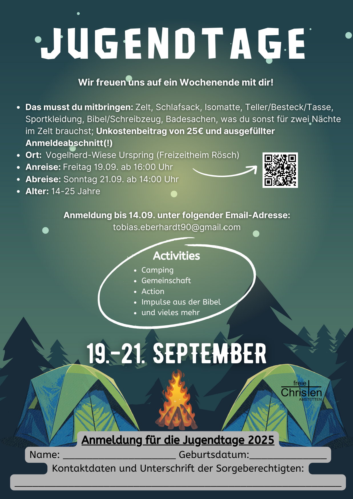 Auch dieses Jahr hatten wir wieder einen wunderschönen Jungschartag in Urspring. Aufgrund des aufziehenden Gewitters am Morgen, spielten wir zunächst ein paar Spiele in der Nähe des Freizeitheims Rösch. Die Regenzeit nutzten wir zum Lieder singen, hörten eine Geschichte aus der Bibel und lernten einen Bibelvers auswendig. Nach dem Mittagessen war der Regen größtenteils vertrocknet, sodass wir uns auf den Weg zur Spielwiese machen konnten. Dort starteten wir mit einem Schmuggelspiel im Wald. Die Kinder waren hoch motiviert, verschiedene Wertgegenstände, ohne von der anderen Gruppe erwischt zu werden, durch den Wald zu schmuggeln. Anschließend gab es Hefezopf, Schneckennudeln und Kekse mit Apfelsaftschorle oder Mineralwasser. Jeder durfte auf der Wiese die verschiedenen Spielgeräte ausprobieren. Wer wollte, konnte sich Gummibärchen verdienen, indem er den Bibelvers von morgens auswendig aufsagte. Als ein paar Regenschauer kamen, bastelten wir in der Hütte. Es gab die Möglichkeit, Spiegel zu verzieren oder ein Spiel aus Holz zu bauen. Vor dem Abendessen hörten wir, wie es weiterging mit Paulus, der einst die Christen verfolgte und nun selbst an Jesus glaubte und anderen von ihm weitersagte. Auch er wurde dafür ins Gefängnis geworfen. Doch Gott rettete ihn durch ein außergewöhnliches Erdbeben, sodass sogar der Gefängnisaufseher erkannte, dass das einzig Richtige ist, umzukehren und an Jesus zu glauben. Zum Abschluss des Tages durften wir viele Eltern begrüßen, ihnen haben die Kinder zunächst kurz erzählt, was sie aus der Bibel gehört haben und dann haben wir Grüllwürste und Stockbrot gegessen.
