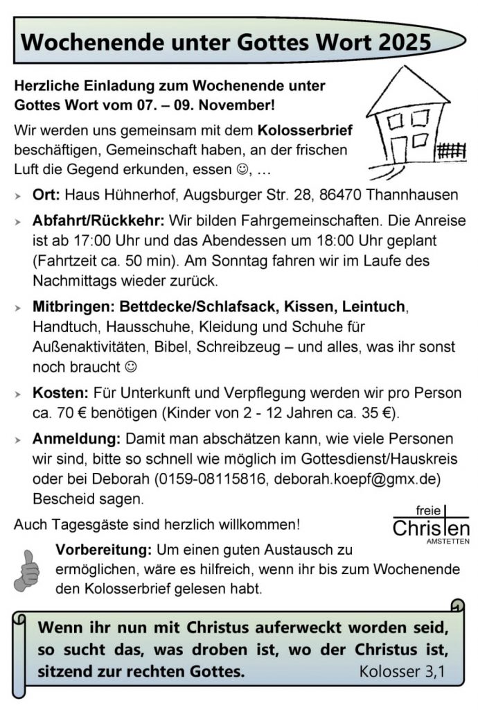 Wir treffen wir uns jeden Sonntag um 10:00 Uhr im Schulhaus in Stubersheim zum Gottesdienst. Für die Kinder im Kindergarten- und Grundschulalter gibt es während der Predigt eine Kinderstunde.