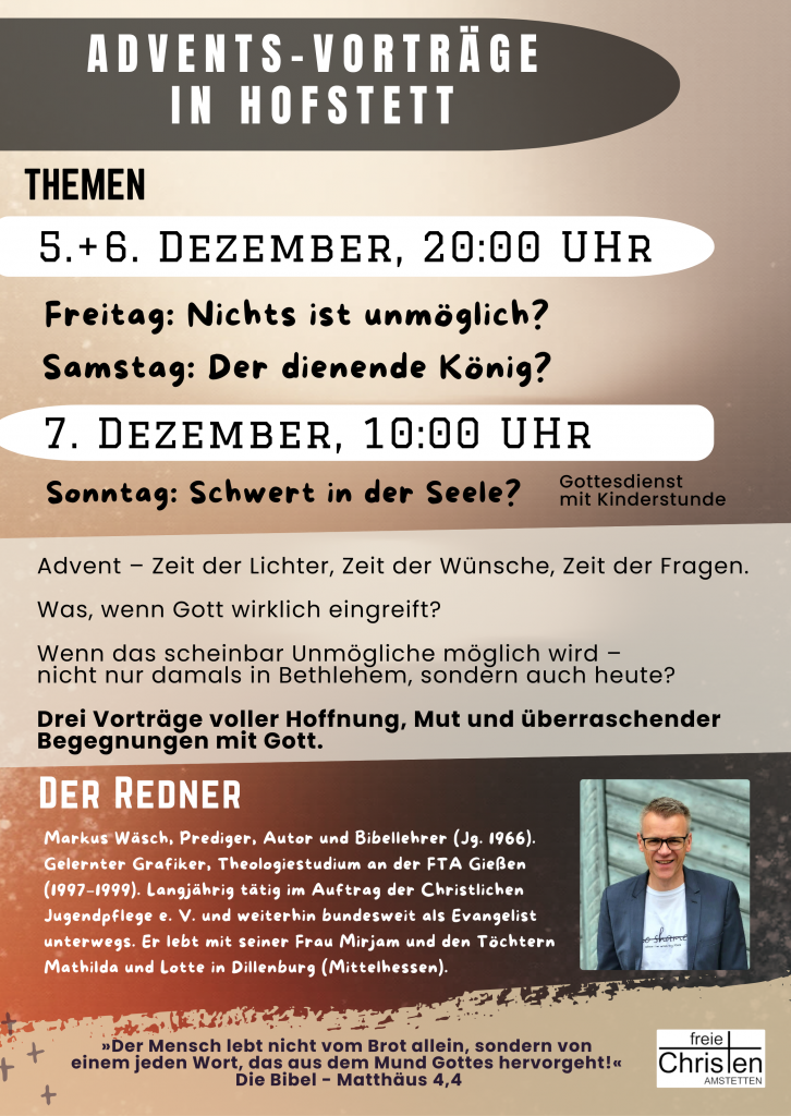 Vom 5.- 7. Dezember 2025 kommt Markus Wäsch zu uns nach Hofstett ins Gemeinschaftshaus. Es geht um drei interessante Themen, rund um das Motto: „Mehr als ein Wunder – was Weihnachten wirklich verändern kann“: