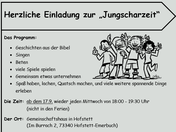 Jeden Mittwoch von 18:00 bis 19:30 Uhr findet im Gemeinschaftshaus (Im Burrach 2) in Hofstett-Emerbuch die „Jungscharzeit“ statt. Hier treffen sich Jungen und Mädchen der 1. bis 8. Klasse aus Hofstett und der Umgebung.